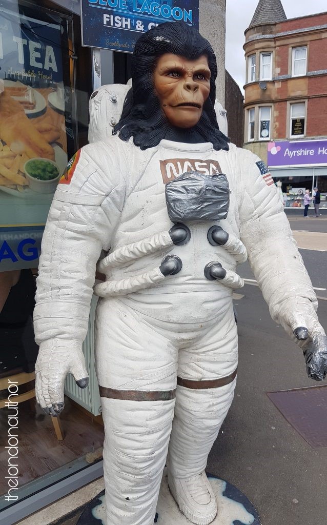 We stopped for lunch at a fish and chip chain that is well known in Scotland called the Blue Lagoon. Bizarrely, there is a man-sized ape in a spacesuit outside. I have yet to discover the relevance of the space monkey vis-a-vis “faesh n chayps” but in any event the latter were yummy and fresh and the service was pleasant. A few seagulls overhead alerted us to being in a seaside town but so far everything looked fairly non-descript. As we walked down from the Blue Lagoon, however, we soon saw more touristy shops selling inflatables and beach-themed fridge magnets.