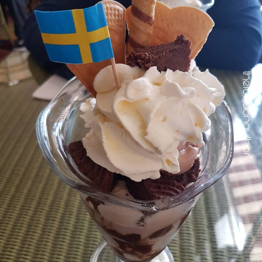 My companion had the “British Strawberry Delight” and I had a “Swedish Hot Fudge Sundae” (Strawberries = British I get, but Swedish sundaes? That’s a new one on me). There were so many tempting choices on the menu but I picked the hot fudge sundae as I usually do if its available partly because (and this is silly) I grew up with the likes of SBTB, Cali Dreams & SVH* so I have a bad case of sehnsucht for a time and place I didn’t actually live in and this also makes me feel nostalgic for that era.